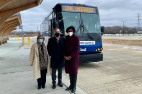 Pace Interim Executive Director Melinda Metzger, Pace Chairman Rick Kwasneski, and Congresswoman Lauren Underwood at the Pace Plainfield Park-n-Ride.